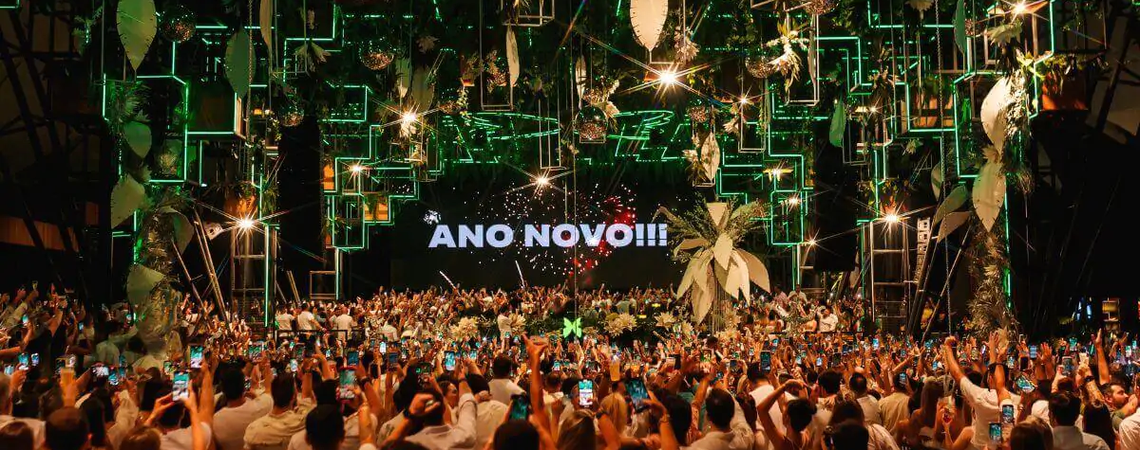 Um cenário transformado: a pista, os lounges, o céu aberto. Todo o club se modifica para esse momento tão especial — um ritual estético e emocional que reforça a identidade vibrante do espaço em meio à natureza, onde o primeiro nascer do sol de 2026 se torna um espetáculo à parte, desenhando-se atrás do palco, como se fizesse parte do line-up.